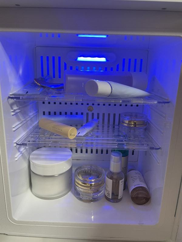냉장고 안에 선크림부터 속눈썹 영양제까지 모든 제품을 다 넣고 사용하고 있어요.